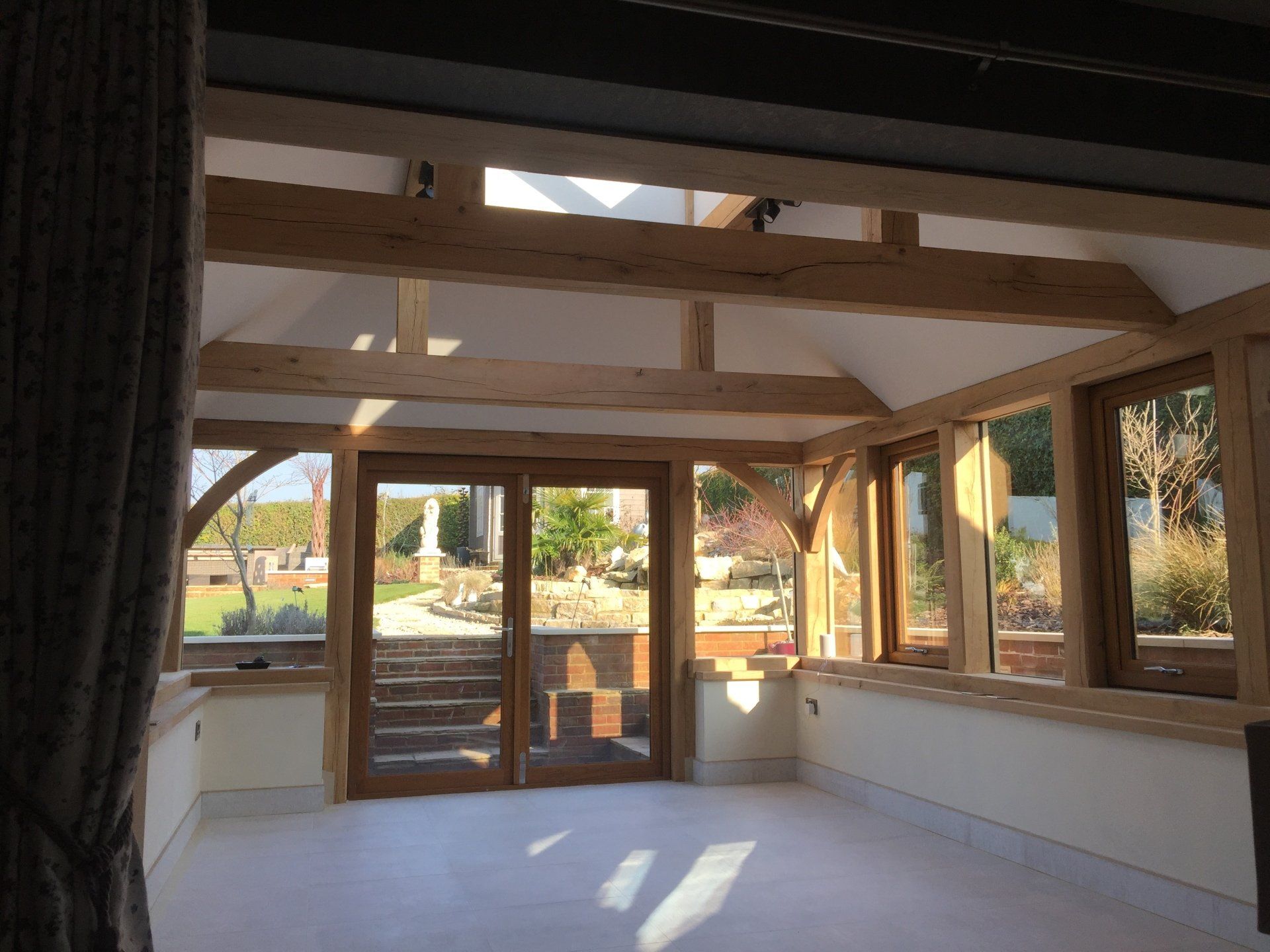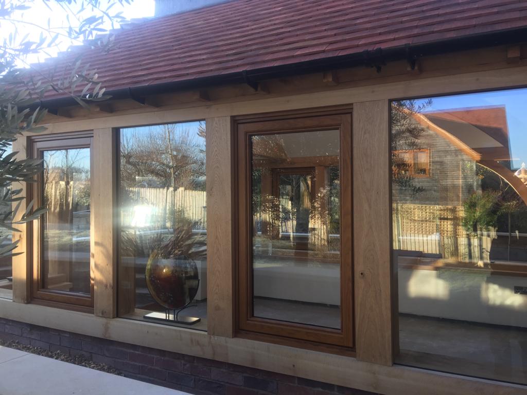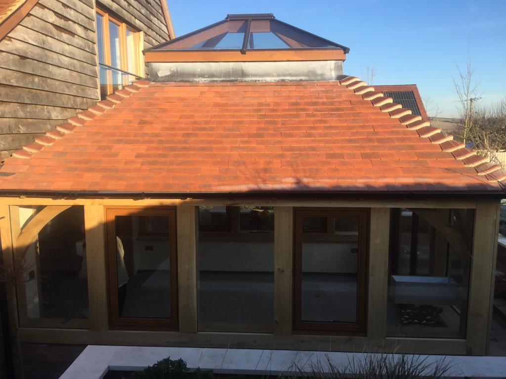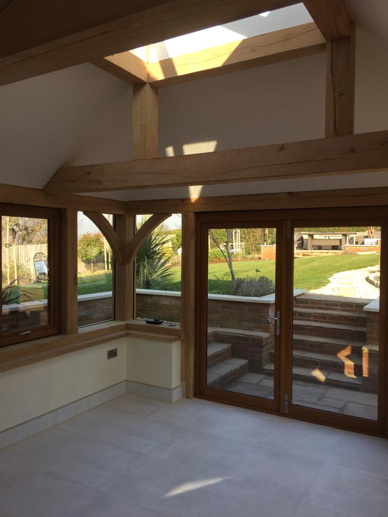 Oak framed extensions, garden rooms and orangeries have increased in popularity in recent years. They provide a substantial extension and are suitable for most styles of property. Oak garden rooms or orangeries can have a flat or fully pitched tile roof with or without a glass roof lantern. They can have partially of fully glazed walls with bi-fold doors, sliding doors or any other type of door. Internally, they often have oak trusses in the roof which add to the beauty of the space. Orangeries and garden rooms can be used all year round due to their thermal efficiency.