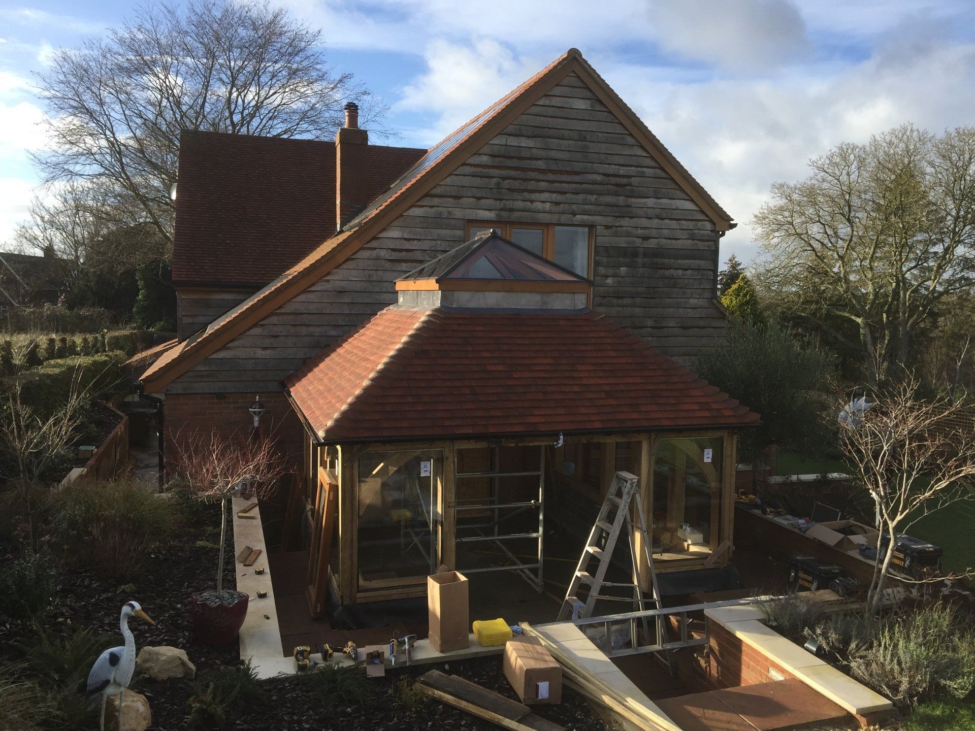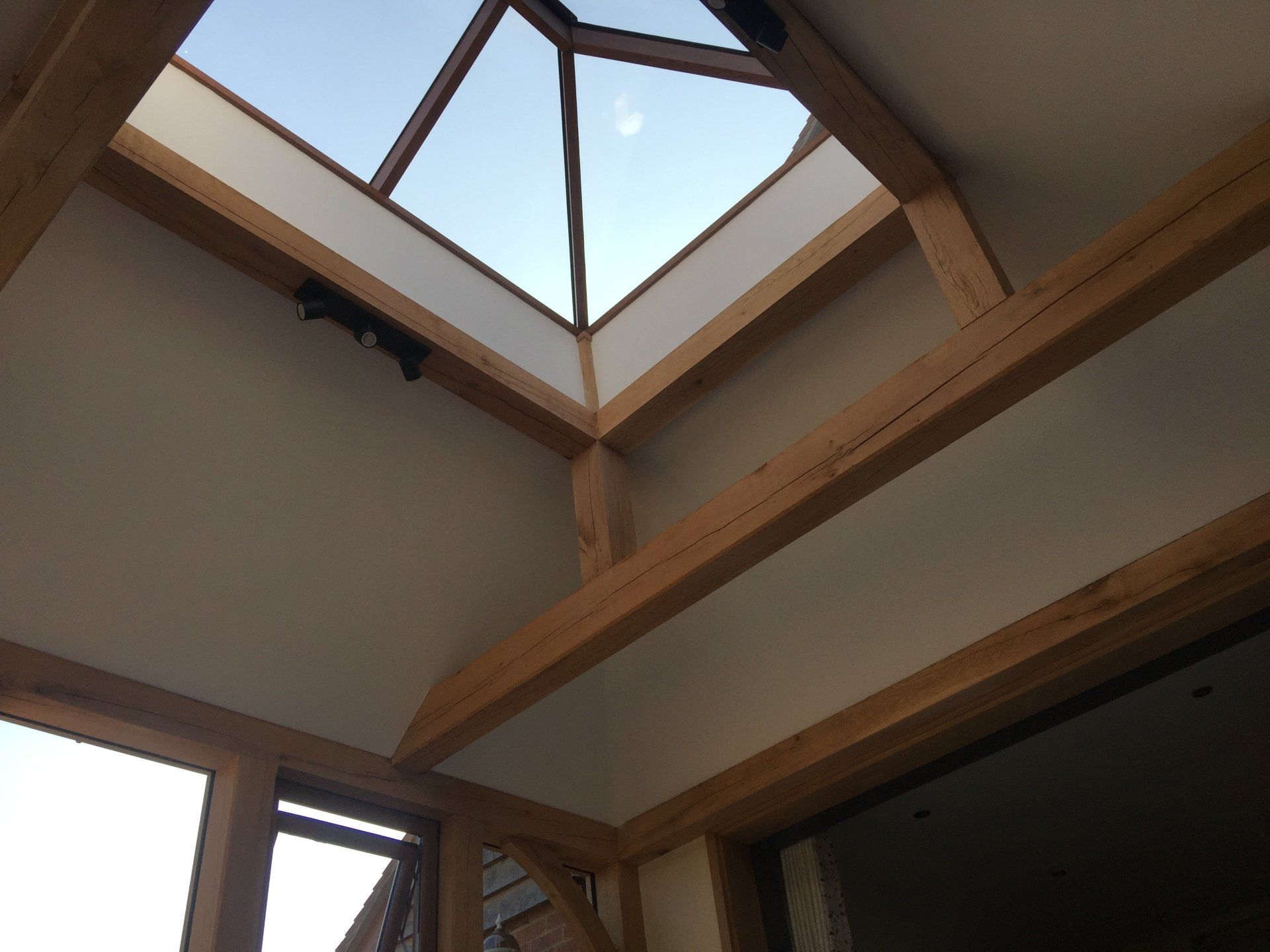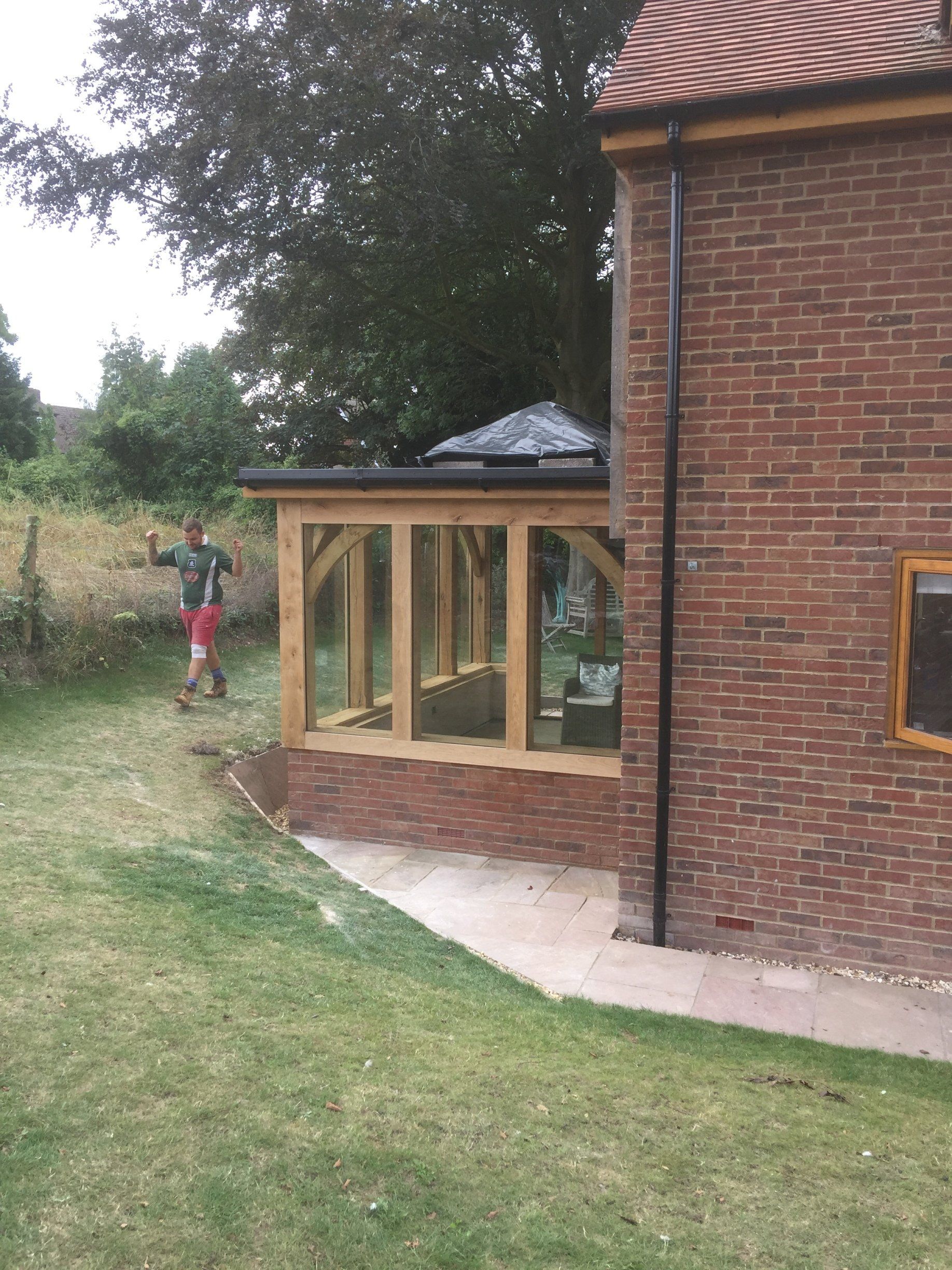 Oak framed extensions, garden rooms and orangeries have increased in popularity in recent years. They provide a substantial extension and are suitable for most styles of property. Oak garden rooms or orangeries can have a flat or fully pitched tile roof with or without a glass roof lantern. They can have partially of fully glazed walls with bi-fold doors, sliding doors or any other type of door. Internally, they often have oak trusses in the roof which add to the beauty of the space. Orangeries and garden rooms can be used all year round due to their thermal efficiency.